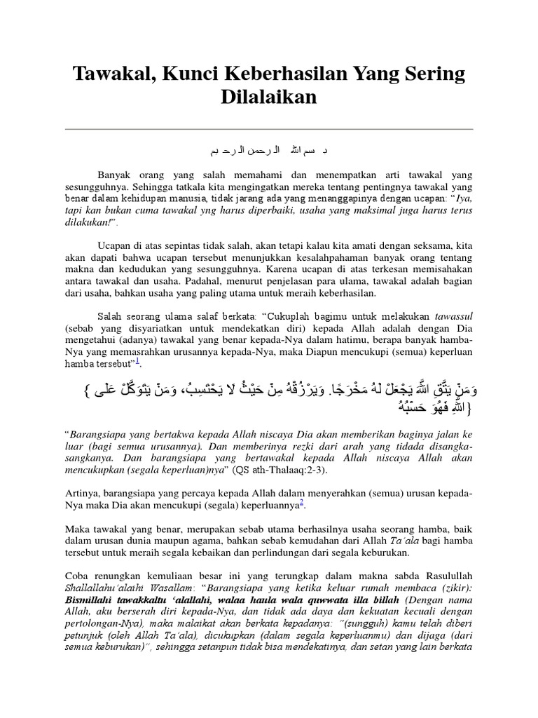 Yang pertama adalah bulan rajab. Tawakal, biasanya kita kaitkan dengan doa dan ikhtiar. Sebuah musibah akan menjadi kenikmatan jika kita berhasil menyikapinya dengan sukur, sabar dan tawakal serta mampu mengambil hikmah dari setiap kejadian. Dikutip situ eramuslim.com seseorang yang bertawakal adalah seseorang yang menyerahkan, mempercayakan segala urusannya hanya kepada allah swt. Jadi pengertian tawakal secara istilah adalah rasa pasrah hamba kepada allah swt yang di sertai dengan segala daya dan upaya mematuhi, setia dan menunaikan segala pertintahnya. Salah satu ciri orang yang optimis adalah ia memiliki harapan yang baik pada saat sebelum melakukan suatu pekerjaan. Apabila arti tawakal diinterpretasikan dengan berdiam diri di sudut kamar dengan menengadahkan tangan, ini justru menghilangkan arti segala perjuangan dan jerih payah yang dilakukan oleh manusia. Kepribadian tawakal ini merupakan salah satu akhlak terpuji. Jika ditilik dari etimologinya, kata ini berasal dari tawakkul (توكُل) yang bermakna mewakilkan atau menyerahkan dalam bahasa arab. Tawakal, arti tawakal, tabayyun, arti tabayyun, manfaat tawakal, dan contoh tawakal. Seseorang yang bertawakal adalah seseorang yang menyerahkan, mempercayakan dan mewakilkan segala urusannya hanya kepada. Dalam agama islam, tawakal berarti berserah diri sepenuhnya kepada allah dalam menghadapi atau menunggu hasil. Ulama dari pelbagai madzhab sepakat bahwa tawasul yang dimaksud adalah amal saleh.